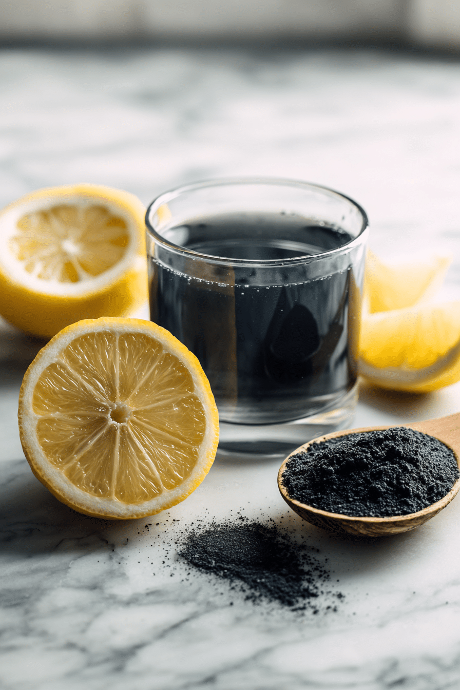 A simple detox drink made with activated charcoal and lemon to help reduce bloating and support digestion.