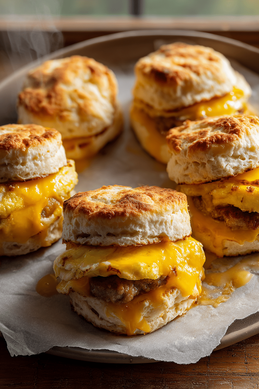 The key is assembling with slightly soft scrambled eggs so they finish cooking inside the sandwich instead of turning rubbery. Splitting and lightly toasting the biscuit halves before assembling prevents soggy bottoms. The result is a sandwich with crisp edges, melted cheese, and a warm, fluffy center.