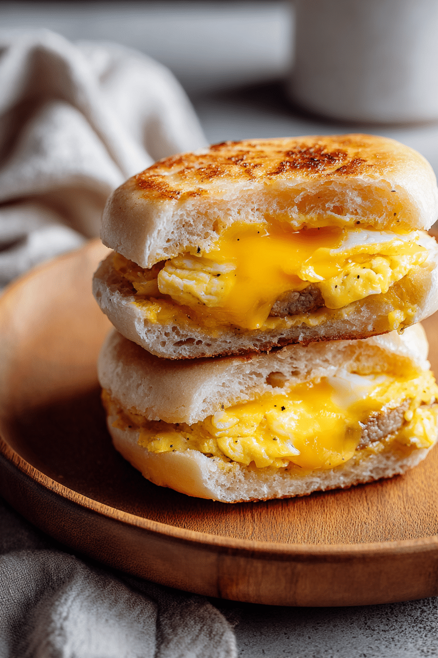 - Assemble sandwiches: bottom muffin, egg round, bacon or sausage, cheese slice, then top muffin.