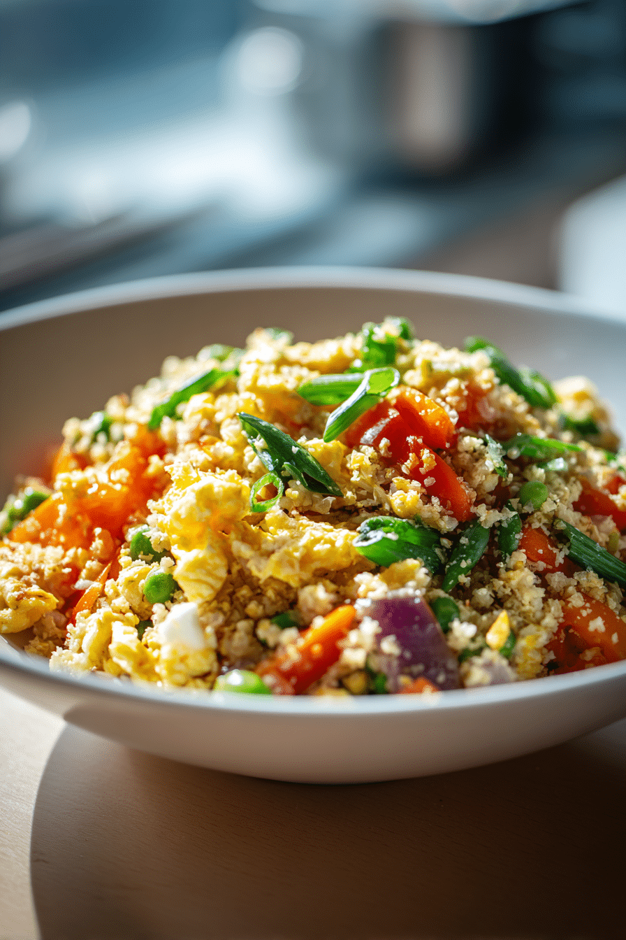 A quick and healthy stir-fry made with cauliflower rice, vegetables, and savory sauce—perfect for a low-carb meal.