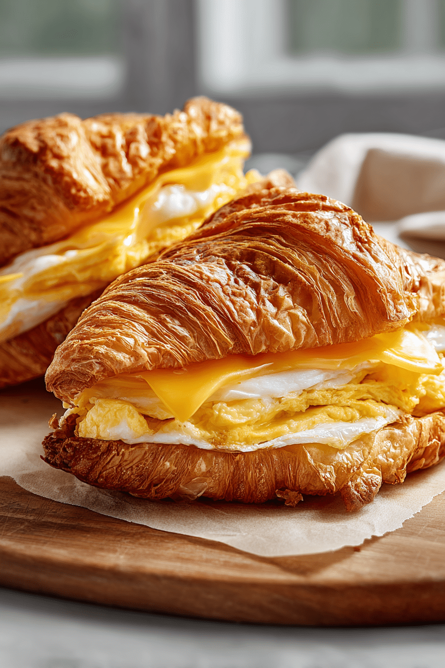 - Assemble sandwiches: bottom croissant half, egg round, cooked meat, cheese slice, and top half.
