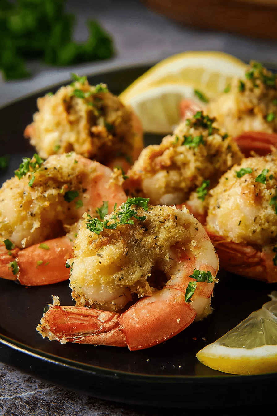 - Cook at 370°F (188°C) for 10–12 minutes, until shrimp are pink and opaque and stuffing is golden.