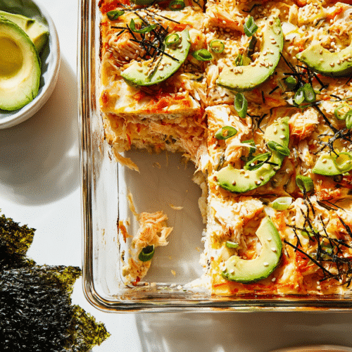 Sushi bake went viral for a reason—it’s comforting, customizable, and easy. By layering seasoned sushi rice, a creamy salmon and mayo mixture, and finishing with spicy toppings, you get all the flavors of a sushi roll in a simple casserole-style dish. Using the air fryer speeds up the process while giving the top layer a slight crisp that makes every bite irresistible.