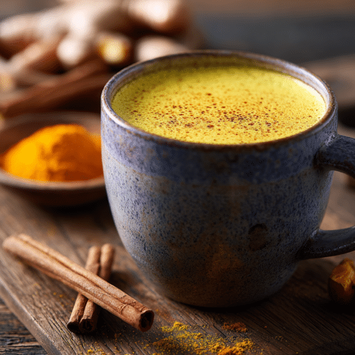A warm turmeric milk drink blended with ginger and black pepper to support digestion and relaxation. Ideal as a soothing evening wellness beverage.