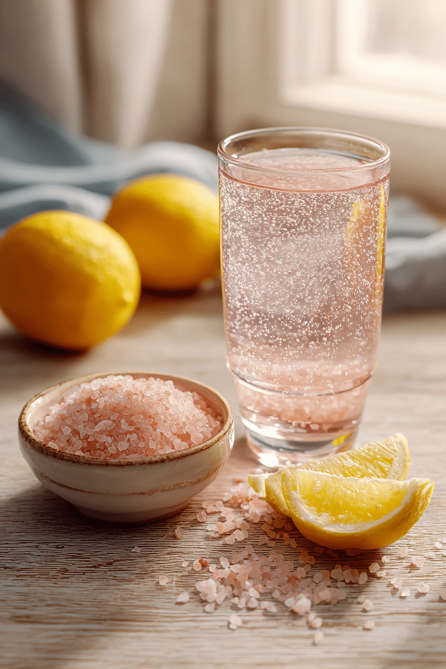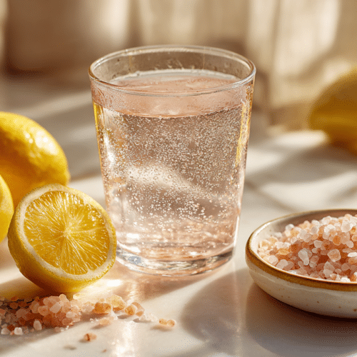 A refreshing electrolyte drink made with Himalayan pink salt and lemon to support hydration and morning energy. Ideal before breakfast or workouts.